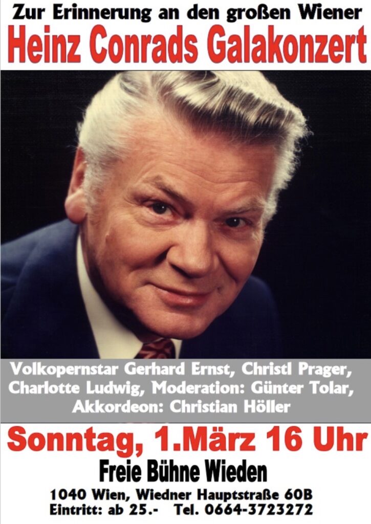 „Heinz Conrads Gala – zur Erinnerung an einen großen Wiener“ mit Charlotte Ludwig von Tera-Vienna, Christl Prager, Gerhard Ernst (Gesang), Christian Höller (Akkordeon) und Günther Tolar (Moderation) – AUSVERKAUFT!